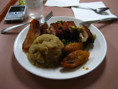 ... meat, fried banana and mofongo. Mofongo is the most typical food in the criolle cuisine and it is meshed green plantains seasoned with garlic, olive oil and pork cracklings. Really tasty. And difficult to forget. Like any local food. Sunday, May 20, 2007